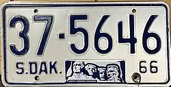 1966 | Embossed dark blue on reflective white with border line; "S.DAK.", stamped Mount Rushmore graphic and "66" at bottom | none | 1-12345 10-1234 |