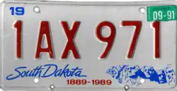 Coded by county of issuance (1 or 10) | Commemorated South Dakota's 100 years of statehood. Numeric county codes reintroduced. Letters I, O and Q not used in serials; this practice continues today.[4] |