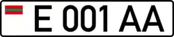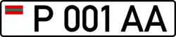 Standard license plates of Transnistria are 520 mm wide and 112 mm high, made of metal with 6 embossed characters - one letter, three numbers and two more letters - written using the DIN 1451 Mittelschrift font. On the left part of the plates there is also a modified euroband on a white background, having the flag of the PMR instead of the EU symbol. A holographic sticker in the place of the international country code underneath it was placed until 2015, when a law was revised, additionally removing black separation line between euroband and registration number;[1] instead, two interpolated grey sine waves were added on the bottom of the plate. Government plates only have 5 embossed characters - three numbers and two letters. Only symbols that are common to both the Cyrillic and the Latin alphabets are used, and with their Cyrillic meaning (A, B, C, E, H, K, M, P, T, X, Y). Its current design derives from Moldovan plates of 1992 design, but is slightly changed. Military plates are using Soviet design from 1959, and tractor plates are also using Soviet design, but from 1980.