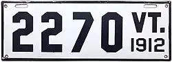 1909 | Black serial on white porcelain plate with border line; "VT. 1909" at right | none | 1234 | 1 to approximately 2000 | First dated plate. |
