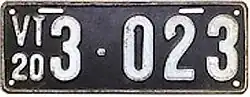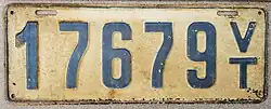 1917 | Embossed blue serial on white plate with border line; vertical "VT" at right | none | 12345 | 1 to approximately 20300 | |