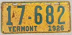 1926 | Embossed green serial on golden yellow plate with border line; "VERMONT 1926" at bottom | none | 12-345 | 1 to approximately 69-000 | |