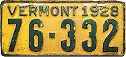 1928 | Embossed green serial on golden yellow plate with border line; "VERMONT 1928" at top | none | 12-345 | 1 to approximately 80-000 | |