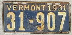 1931 | Embossed white serial on dark blue plate with border line; "VERMONT 1931" at top | none | 12-345 | 1 to approximately 76-000 | |
