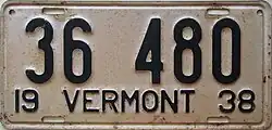 1938 | Embossed dark blue serial on white plate; "19 VERMONT 38" at bottom | none | 12 345 | 1 to approximately 78 000 | |