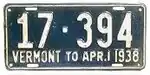 1937–38 | Embossed white serial on dark blue plate with border line; "VERMONT TO APR. 1 1938" at bottom | none | 12-345 | 1 to approximately 77-000 | |