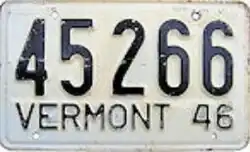 1946 | Embossed black serial on white plate; "VERMONT 46" at bottom | none | 12345 | 1 to approximately 88000 | |