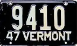 1947 | Embossed white serial on black plate; "47 VERMONT" at bottom | none | 12345 | 1 to approximately 93000 | |