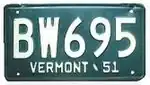 1951 | Embossed white serial on dark green plate; "VERMONT 51" centered at bottom | none | A123 | A1 to W999 | Letters I, O, Q, T, X and Y not used in serials.[2] |