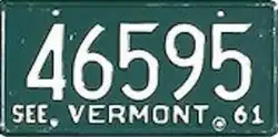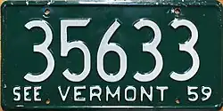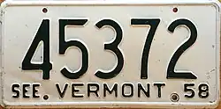 | 1958 | Embossed dark green serial on white plate; "VERMONT" centered at bottom; "58" at bottom right | "SEE" to left of state name, giving "SEE VERMONT" | 12345 | 1 to 99999 | ||
