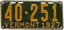 1927 | Embossed golden yellow serial on green plate with border line; "VERMONT 1927" at bottom | none | 12-345 | 1 to approximately 75-000 | |