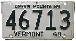 1949 | Embossed dark green serial on white plate; "VERMONT 49" centered at bottom | "GREEN MOUNTAINS" centered at top | 12345 | 1 to approximately 99000 | |