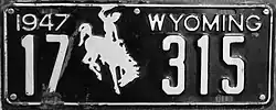1947 | Embossed white serial and Bucking Horse and Rider on black plate with border line; "1947 WYOMING" at top | 1-12345 10-1234 |