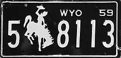 1959 | Embossed white serial and Bucking Horse and Rider on black plate with border line; "WYO 59" at top right | 1-1234 1-123A 1/0-1234 |