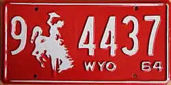 1964 | Embossed white serial and Bucking Horse and Rider on red plate with border line; "WYO 64" at bottom right | 1-1234 1-123A 1-A123 1/0-1234 1/0-123A |