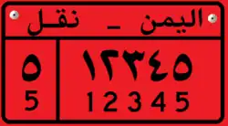 Unlike the aforementioned governorates, Taiz Governorate has not replaced the previous and other existing registration plates with a uniform new format like the rest of southern Yemen but uses the Mandatory typeface for numerals and Square Kufic for Arabic text since 2018.[1] Taiz Governorate traffic police have introduced two classes of "Temporary" License plates for vehicles missing a license plate. It is unclear how long such temporary plates will remain in circulation and what format will replace them, but they are de facto the current license plate format issued by the governorate.[8] Taiz temporary license plates have a top row that states "ج - ي" (J.Y.), standing for "Republic" and "Yemen" in Arabic. There is also the text "مؤقت - تعز", meaning "Temporary" and "Taiz", the name of the governorate.