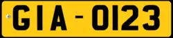 52 cm x 11 cm Black on yellow Gambian Flag as well as the text GPF on the top left corner of the license plate |