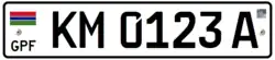 From 2019 onwards, a black-on-white colour scheme was introduced. This new license plate format uses the font FE-Schrift. The flag strip at the bottom of the license plate has been removed in this version, and replaced by a flag on the top left corner of the plate. Underneath the plate, there's a 3-letter code, GPF. GPF isn't the country's standard traffic code, that would be WAG. GPF stands for The Gambia Police Force, who are responsible for issuing of the license plates.