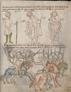 The Velislaus Bible or Velislav's Bible (Czech: Velislavova bible; Latin Velislai biblia picta) is an illuminated manuscript of 1325–1349. It is in effect a picture-book of the Bible, as the text is limited to brief titles or descriptions of the 747 pictures from the Old Testament and the New Testament, from the writings about the Antichrist and from the legends of the saints, especially St Wenceslas. It is therefore an example of a Biblia pauperum, though not in the typical form, having many more images. Most of the illuminations are only in ink, though some colour is used.