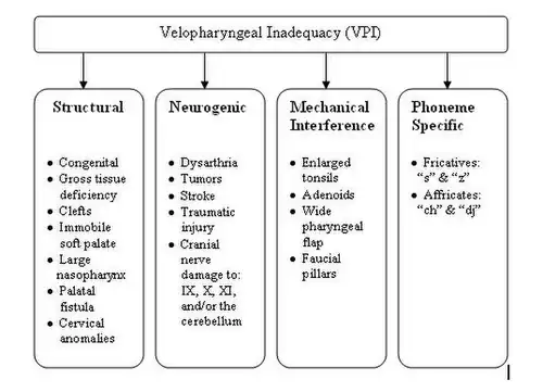 Velopharyngeal inadequacy is a malfunction of a velopharyngeal mechanism which is responsible for directing the transmission of sound energy and air pressure in both the oral cavity and the nasal cavity. When this mechanism is impaired in some way, the valve does not fully close, and a condition known as "velopharyngeal inadequacy" can develop. VPI can either be congenital or acquired later in life.