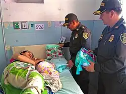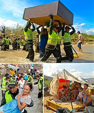 ![]() Images from top, left and right: Colombian National Police assisting refugees with their belongings. An elderly Colombian refugee being carried by a Colombian National Police officer. Colombian refugees in a makeshift shelter seeking shade. | |