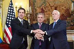 Guaidó traveled from Cúcuta to Bogotá for a 24 February meeting with US Vice President Mike Pence,[186][187] and a 25 February meeting of the Lima Group.[188][189] The group urged the International Criminal Court to pursue charges of crimes against humanity for the Maduro administration's use of violence against civilians and blockade of humanitarian aid.[190][191]