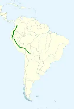 The bar-bellied woodpecker's subspecies equifasciatus is the northernmost; it is found from Colombia's central Andes south through Ecuador and into northern Peru's Amazonas Department. Subspecies pectoralis is found on the eastern slope of the Peruvian Andes from Amazonas to Junín Department. The nominate subspecies is found on the east slope of the Andes from Junín in Peru to central Bolivia's Cochabamba and Santa Cruz departments.[2][7]