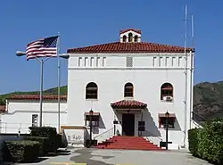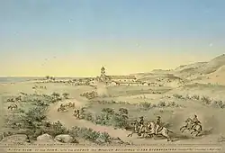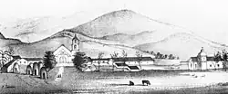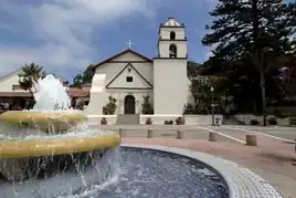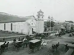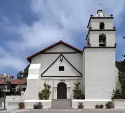 In 1769, the Spanish Portolà expedition, first recorded European visitors to inland areas of California, came down the Santa Clara River Valley from the previous night's encampment near today's Saticoy and camped near the outlet of the Ventura River on August 14. Fray Juan Crespi, a Franciscan missionary traveling with the expedition, noted that "we saw a regular town, the most populous and best laid-out of all that we had seen on the journey up to the present time."[20] Archaeological records found that the Chumash village they encountered was settled sometime around AD 1000. Junípero Serra, first leader of the Franciscans in California, founded Mission San Buenaventura in 1782 as his ninth and last mission established near the Chumash village as part of Spain's colonization of Alta California.[21] The mission was named for St. Bonaventure, a 13th-century Franciscan saint and a Doctor of the Church. San Miguel Chapel was the first outpost and center of operations while the first Mission San Buenaventura was being constructed. The first mission burned in 1801 and a replacement building of brick and stone was completed in 1809. The bell tower and facade of the new mission was destroyed by an 1812 earthquake.[22][23] The Mission was rebuilt and functions as a parish church.