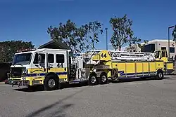 Ventura County uses two main types of engines. The first is the standard engine, which is often referred to as a "triple-combination pumper" as it has a fire pump, water tank and fire hose. Each engine can deliver 1,500 GPM of water and carry 500 gallons of water. The engines also carry multiple ground ladders and different types of hose as well as various types of firefighting, rescue and medical equipment.[6] The second type of engine is the Medic Engine. The only real difference between the medic engine and the standard engine is that the medic engines are capable of advanced life support (ALS) with a firefighter also being a fully trained Advanced Life Support (ALS) paramedic. These units have additional equipment on board for specialized emergency responses.[7]