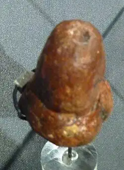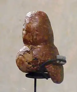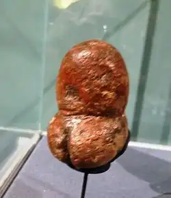 The figurine is 7.2 centimetres (2.8 in) tall, made of limestone and is covered with red ochre.[2] The statuette can be interpreted in two ways: as a stylized depiction of a woman with large buttocks or as a penis with testicles.[3] At the upper side is a deepening, which can be interpreted as the ending of the urethra. This kind of double-sexed depiction can also be found in several other figurines of the paleolithic era, among them sculptures from Dolni Vestonice, Gönnersdorf, Nebra, Mezin (Ukraine), Milandes, Oelknitz, Savignano, Trasimeno and Trou Magrite.