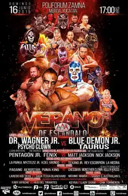 Verano de Escándalo (2019) (Spanish for "Summer of Scandal") was a major professional wrestling event produced by the Mexican Lucha Libre AAA Worldwide (AAA) promotion event, which took place on June 16, 2019 in Poliforum Zamná in Merida, Yucatán, Mexico.[1] The Verano de Escándalo event has been a regular summer event for AAA since 1997, only skipping the event in 2012, 2013 and 2016. 2019 marking the 20th time AAA has used that name for an event.