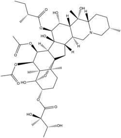 - ^ Ujvary, Istvan; Eya, Bryan K.; Grendell, Richard L.; Toia, Robert F.; Casida, John E. (October 1991). "Insecticidal activity of various 3-acyl and other derivatives of veracevine relative to the veratrum alkaloids veratridine and cevadine". Journal of Agricultural and Food Chemistry. 39 (10): 1875–1881. doi:10.1021/jf00010a039. ISSN 0021-8561.