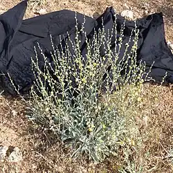 It is a moderately high (typically to 50 cm) perennial with many narrow greyish tongue-like leaves at the base, smaller stem leaves, and at the top a broad branched spray of yellow flowers. Considered closely, the stems are rather slender, the leaves have weakly crenate margins, and the flowers are yellow on short stalks, grouped in small clusters of 1-3, with 5 kidney-shaped anthers. Genetically the plant has no near allies.[3]