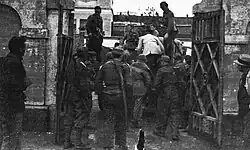 Morsero and Colonel Fracassi finally decided to accept the surrender conditions, challenged, however, by the officers,[40] who did not trust the partisans and were convinced they could hold out until the Allies arrived.[41] The same surrender conditions were accepted in the same hours by a nearby German garrison.[42] On the following day, April 28, the surrender of the column to partisan forces and the handing over of weapons, many of which were previously rendered unserviceable, took place. Prefect Morsero was picked up by the partisans and transferred to Vercelli, where he was imprisoned. The prisoners, separated from the women and children, were instead taken to Novara and locked up by the partisans in the Viale Alcarotti stadium, in those days used as a concentration camp.[43] During the transfer, despite the terms of the surrender even the officers were deprived of their weapons, which had been kept up to that point.[44]