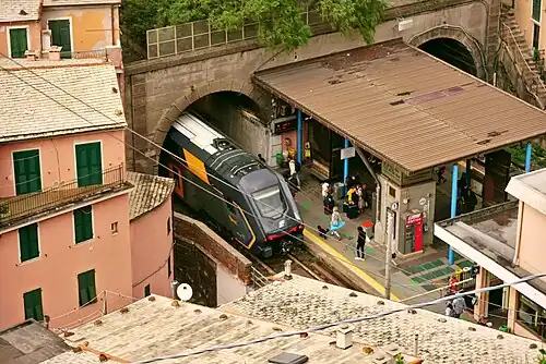 A double-track line was opened between Monterosso and Corniglia on 15 January 1962, including a new station at Vernazza,[3][4] which was located to the east of the old station between the Riolo and Vernazza tunnels. Due to the lack of available space, the new infrastructure was built partly in the open air on the site of the goods siding on the mountain side of the line and partly in enlarged sections of both the pre-existing Riolo tunnel and the new Monterosso–Ruvano tunnel. The new arrangement made it possible to build a passenger building and a small freight yard, which was of great importance given the lack of road links that characterise the town.[5]