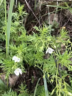 A perennial speedwell native to the east of the Black Sea also grown in gardens, with stems ascending to 30 cm; it has white flowers with purple veins that fade to pink at the centre (sometimes faint), and leaves very parted into many narrow divisions which may themselves divide, with margins curling under; it is hairy, sometimes very greatly. Its fruits are a hairy capsule, 4 × 6 mm.[2][3]