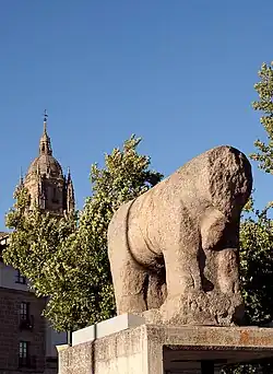![]() Verraco of the bridge with the cathedral of Salamanca behind | |