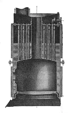 The relatively rare Fowler steam wagons used a boiler of this form.[4] The main barrel of the boiler contained a nest of curved firetubes between the stayless firebox and a large open space that formed a smokebox containing a five-turn spiral tube superheater. Both tubeplates were domed inwards, making them strong enough to not require staying. The firetubes were curved to 'cause eddies in the hot gases as they rise',[4] to allow for free expansion with heat and also to allow a perpendicular joint between tube and tubeplate.