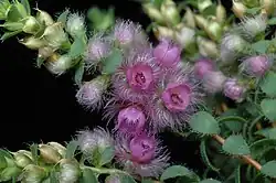 The flowers are scented and arranged in spikes near the ends of the branches, each flower on a stalk 1.0–1.5 mm (0.04–0.06 in) long. The floral cup is top-shaped, 2.0–2.5 mm (0.08–0.1 in) long, has 5 rounded ribs and a slightly warty surface. The sepals are pale to deep mauve-pink, 4.0–4.5 mm (0.16–0.18 in) long, with 6 or 7 lobes with thread-like fringes. The petals are the same colour as the sepals, 4.0–4.5 mm (0.16–0.18 in), broadly egg-shaped with a fringe 1.0–1.5 mm (0.04–0.06 in) long. The style is S-shaped, about 3.5–5 mm (0.14–0.20 in) long, and has a dense beard of hairs 0.5 mm (0.02 in) long. Flowering time is from late November to February.[2]