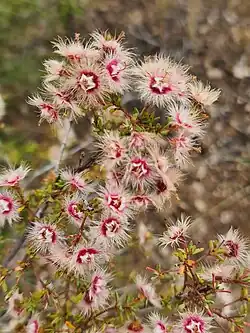 The flowers are scented and arranged in rounded groups near the ends of the branches, each flower on a stalk 5–13 mm (0.2–0.5 in) long. The floral cup is shaped like half a sphere, 2.8–3.5 mm (0.11–0.14 in) long, and has 10 ribs, is more or less smooth but hairy near the top. The sepals are white, cream or pale pink, 5.0–5.5 mm (0.20–0.22 in) long, and have 2 to 4 lobes with long, thread-like edges. The petals are broadly egg-shaped, pink, cream-coloured or white, 3.2–4 mm (0.13–0.16 in) long, with a fringe of long, thread-like hairs. The style is 4–7 mm (0.2–0.3 in) long and covered with hairs over most of its length. Flowering time is from October to December.[3]