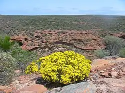 The flowers are usually scented, arranged in a corymb-like groups on the ends of the branches, bright yellow but ageing to bronze or brown, sometimes only in the centre. The flowers are held erect on stalks 4–18 mm (0.2–0.7 in) long. The floral cup is shaped like half a sphere about 1.5 mm (0.06 in) long, with 10 ribs, glabrous and slightly warty. The sepals are bright yellow, 4.0–4.5 mm (0.16–0.18 in) long, with 7 or 10 densely feathery lobes. The petals are also bright yellow, egg-shaped, 3.5–5.0 mm (0.14–0.20 in) and have long, spreading finger-like lobes. The style is 3.5–4 mm (0.14–0.16 in) long, straight or slightly curved. Flowering time is from September to December.[1][2]