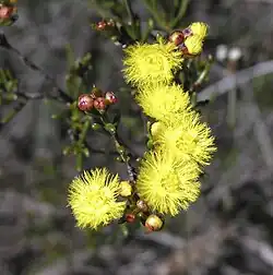 The flowers are usually scented, arranged in corymb-like groups on the ends of the branches, lemon-yellow or golden-yellow but ageing to orange, red or brown. The flowers are held erect on stalks 6–10 mm (0.2–0.4 in) long. The floral cup is shaped like half a sphere, 1.0–1.5 mm (0.04–0.06 in) long, glabrous and slightly warty. The sepals are bright yellow, 3.0–3.5 mm (0.12–0.14 in) long, with 6 or 7 feathery lobes. The petals are bright yellow, 3.0–3.5 mm (0.12–0.14 in) and have long, spreading finger-like lobes. The style is 3.0–3.5 mm (0.12–0.14 in) long, straight and glabrous. Flowering time is from July to December.[1]