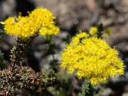 The flowers are arranged in rounded groups on the ends of the branches, each flower on a stalk 10–12 mm (0.4–0.5 in) long. The floral cup is top-shaped, 2–3 mm (0.08–0.1 in) long and hairy with small swellings beneath each sepal. The sepals are bright yellow, 4–6 mm (0.16–0.24 in) long and are deeply divided and hairy. The petals are a similar colour, erect, 2.5–5 mm (0.1–0.2 in) long, egg-shaped to almost round with a hairy margin. The style is 3–5.3 mm (0.1–0.2 in) long, straight, and has long white hairs along its length. Flowering time is from October to January, depending on subspecies.[2]