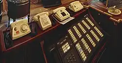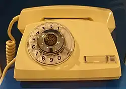 Since the 1970s, conventional four-wire devices have been used as Vertushka telephones, from a circuit engineering point of view. Their distinctive feature was the State Emblem of the Soviet Union on the dialer and increased protection against radio leakage (shielding of parts, graphite coating inside the case). In the Soviet Union, there was a strict rule according to which only the owner of the device was obliged to answer calls from the ATS-1. In his absence, a special duty officer had to pick up the receiver with the words: "The device of comrade [Yakovlev]". After the collapse of the USSR, the rules quickly began to become a thing of the past, ministers began to move ATS-2 and even ATS-1 devices to the reception area. As a result, dialing via government communications began to take almost as much time as via a regular city line, and the prestige of the "vertushka" fell sharply. The restoration of strict rules began in 1996 by order of Viktor Chernomyrdin.[8] Following the dissolution of the Soviet Union governmental telephones were produced with the Coat of arms of Russia.