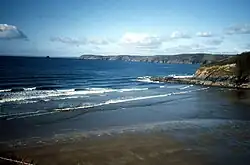Veryan Bay along the southern coast of Cornwall, England, is a curving, natural bay that stretches for 4.6 miles in width and recedes by up to 1.5 miles. It lies between the Peneare Head to the west and Dodman Point at the east. The shoreline varies in height from 20 to 200 feet, with indentations forming bights.[1][2] Along the bay is Porthluney Cove, which is overlooked by Caerhays Castle.[3]
