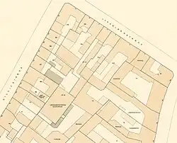 Vestergade 14 was in 1388 part of a larger property owned by Herstedvester Church. The property was later divided into smaller lots, then merged and divided several times. Present day No. 14 consisted of two lots when the entire area was destroyed in the Copenhagen Fire of 1728. The (eastern) lot at the corner measured 6,25 metres towards Vestergade and 10 metres towards Larsbjørnsstræde. The western lot measured 7,50 metres towards Vestergade, 13.75 metres towards Larsbjørnsstræde and was 26 metres deep at its western boundary towards No. 16.[1]