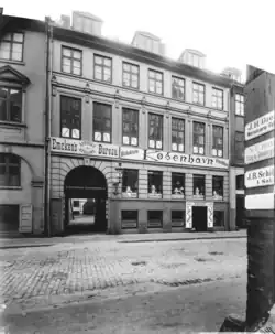 The buildings on the site were destroyed in the Copenhagen Fire of 1728, together with the nearby City Hall and most of the other buildings in the area. After the fire, the two fire sites were merged into ine property. The two properties were later merged into a single property. It was listed in the new cadastre of 1756 as No. 235 in Western Quarter, owned by wine seller (vintapper) Christian Lindemand.[2]