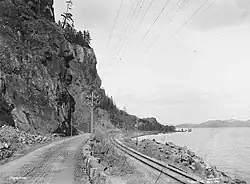 During construction of a level crossing at Smørstein on 17 August 1918 the area around the track started experiencing a series of landslides.[27] Within a few days the earthwork under the tracks had slid away. Vy hired a steamship to freight passengers and cargo past the effected area, and part of the traffic was freighted across the fjord from Horten to Moss.[28] A temporary line was built close to the mountain, while construction took place of a temporary solution, the Smørstein Tunnel.[29] The temporary line opened on 28 October 1918 and the new segment with a tunnel on 25 May 1921.[30]