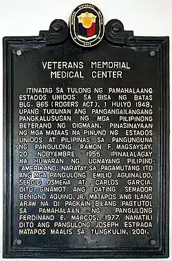 The Veterans Memorial Medical Center (formerly known as Veterans Memorial Hospital and commonly abbreviated as VMMC) was established on November 20, 1955 with full US Government assistance under the US Veterans Administration to provide quality hospitalization, medical care and treatment to Filipino veterans as provided by U.S. public law. The patients were originally those who suffered from service-connected disabilities arising from their services with the USAFFE, recognized guerrilla units, Philippine Scouts, and Philippine Commonwealth Army, which was later extended to AFP retirees and their dependents.