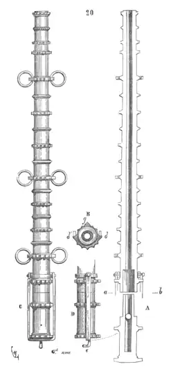 The Veuglaire was up to 2 meters (8 feet) long, and weighing from 150 kg to several tonnes, and compares to the Crapaudins or Crapaudaux, which were shorter (4 to 8 feet) and lighter than the Veuglaires.[3] The Veuglaires were usually breech-loading, and therefore used a separate "powder chamber" (boîte à poudre) in which powder and ball were located upon loading,[4][5] and the main body of the cannon was formed of a tube opened at both ends.